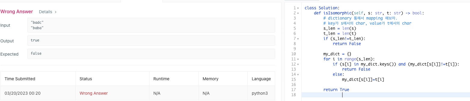if (s[i] in my_dict.keys()) and (my_dict[s[i]]!=t[i]):